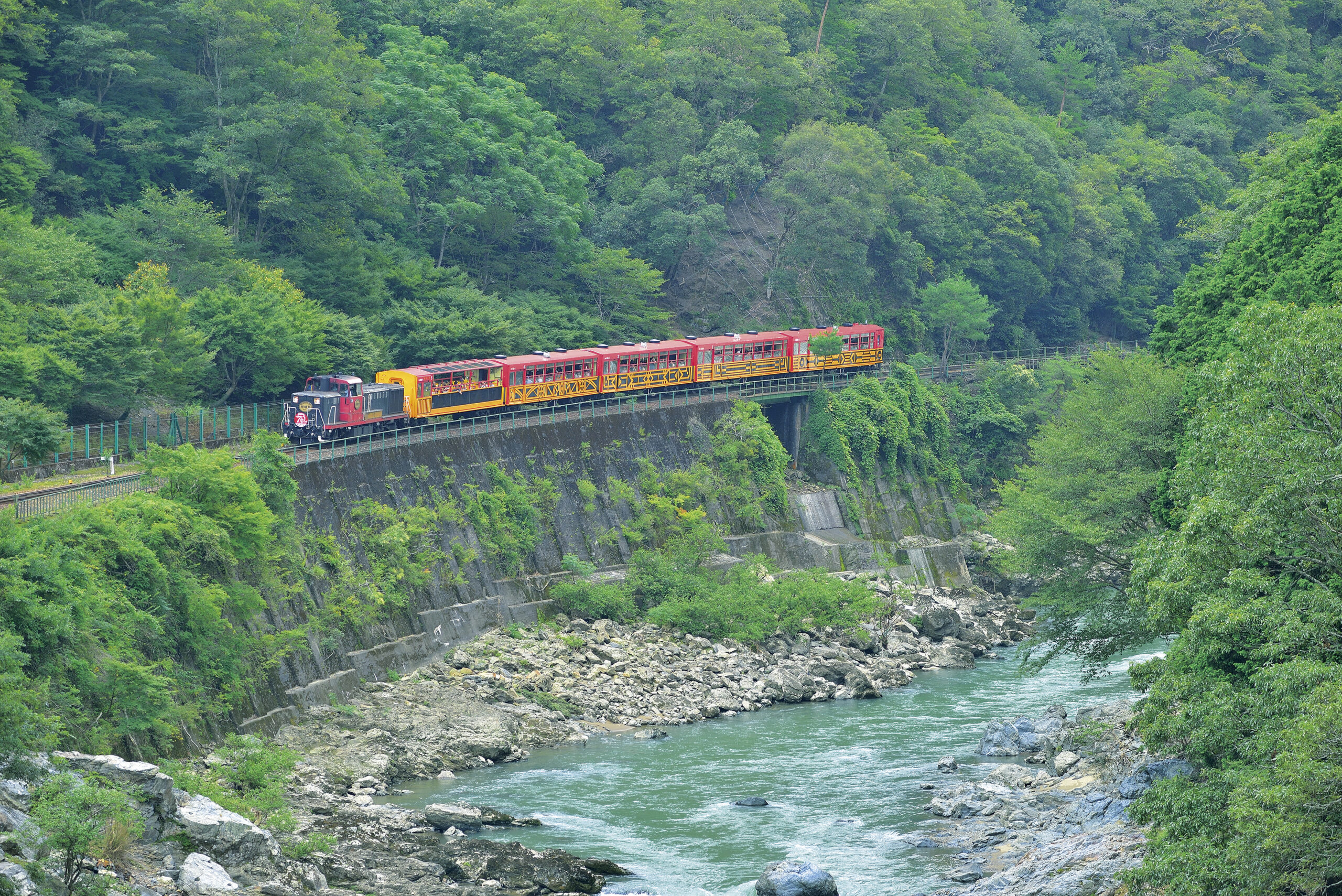 嵐山から亀岡間約7,3kmの列車旅を堪能出来ます。なかでも5両編成の最終車両、窓ガラスのない「ザ・リッチ号」の爽快感は格別です。