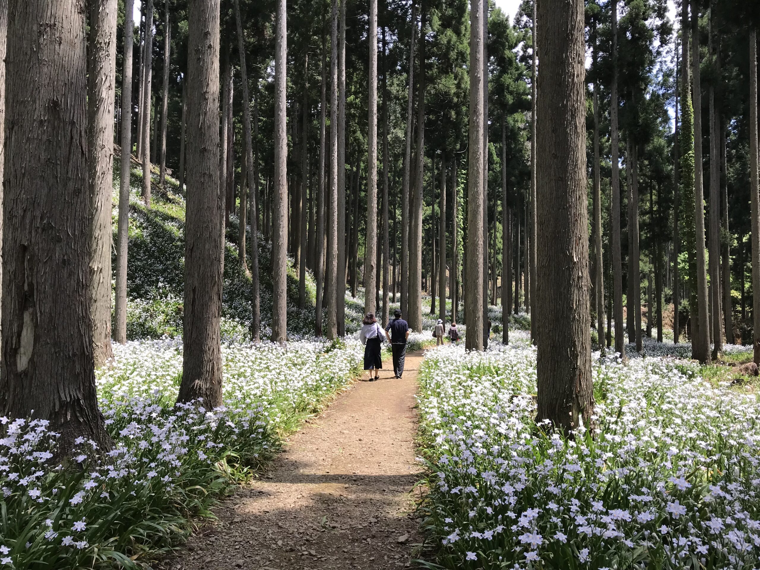 水源の里・老富では、ミツマタが杉林一面を埋め尽くし、幻想的な光景が見られます。ミツマタが終わると見渡す限りの白いシャガが目の前に広がります。